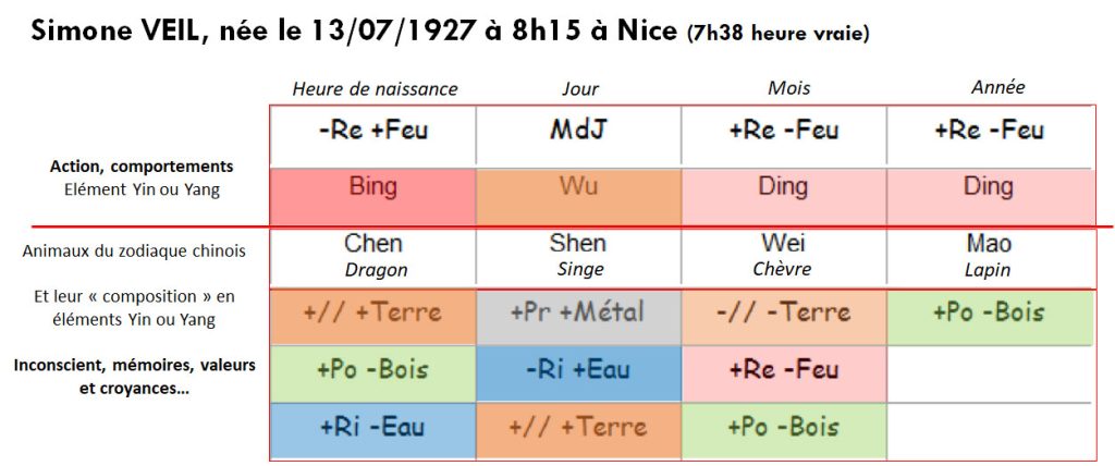 Chaque case de ce tableau est remplie par un des éléments de la tradition chinoise : Bois, Feu, Terre, Métal, Eau – tous dotés d’une polarité Yin ou Yang, qui possède un rôle particulier dans la trame de la personne : Amis, Ressource, Production, Richesse, Pouvoir.